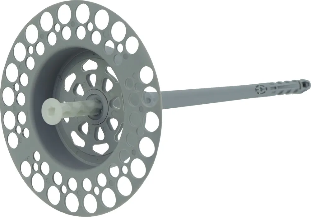 Talířová hmoždinka s ocelovým šroubovitým trnem.